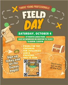 Join our Young Professionals and Adults as we have a Field Day at North Lakes Park from 12:00 pm-2:00 pm. We will be splitting into teams and competing for prizes! 2001 W Windsor Dr Denton Tx 76207 Lunch is provided and it's free to participate, all we ask is that you register for the event.